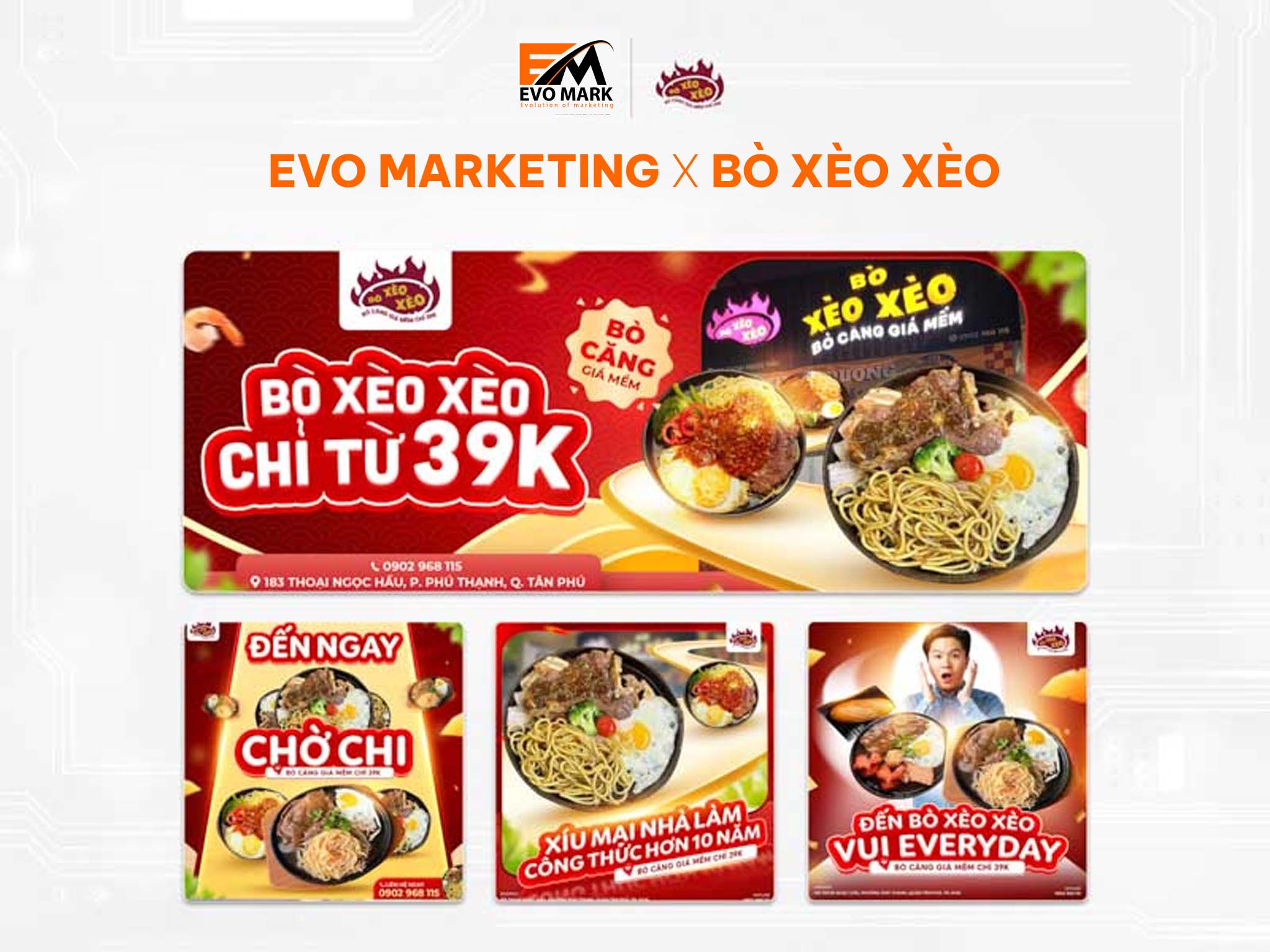 Để gia tăng nhận diện thương hiệu, tiếp cận khách hàng tiềm năng và thúc đẩy doanh thu, Bò Xèo Xèo đã hợp tác cùng Evo Mark Digital triển khai chiến dịch Marketing tổng thể. Chiến dịch bao gồm kế hoạch content social media bài bản, chăm sóc fanpage chuyên nghiệp, thiết kế hình ảnh sáng tạo và chạy quảng cáo Facebook Ads hiệu quả.