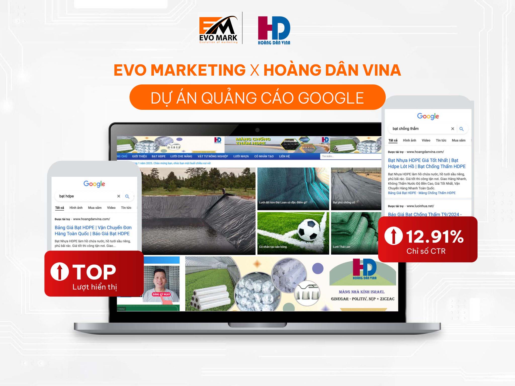Hoàng Dân Vina là tổng kho chuyên cung cấp lưới nhựa, lưới che nắng, bạt chống thấm HDPE, màng nhà kính, vật tư nhà kính, với hệ thống phân phối rộng khắp cả nước. Nhằm gia tăng lượng khách hàng tiềm năng và mở rộng quy mô bán hàng, Hoàng Dân Vina đã hợp tác cùng Evo Mark triển khai chiến dịch quảng cáo Google Ads, tối ưu hiển thị thương hiệu trên công cụ tìm kiếm, thu hút khách hàng chất lượng và nâng cao doanh số.