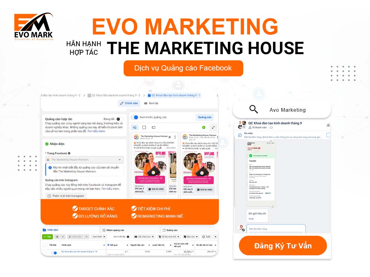 Để đưa hình ảnh của The Marketing House đến gần hơn với khách hàng tiềm năng, tăng tỷ lệ chuyển đổi và tối ưu hiệu quả quảng cáo, Evo Mark đã triển khai chiến dịch Facebook Ads bài bản, giúp The Marketing House mở rộng tệp khách hàng và gia tăng giá trị thương hiệu.