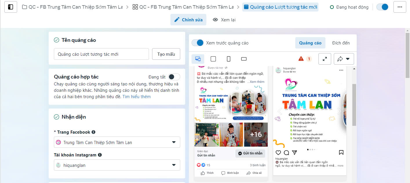Với mong muốn mang đến nhiều cơ hội hơn cho trẻ và gia đình, Trung Tâm Tâm Lan đã hợp tác cùng Evo Mark để triển khai chiến dịch quảng cáo Facebook Ads. Không đơn thuần chỉ là một chiến dịch tiếp thị, đây là một hành trình lan tỏa giá trị nhân văn, giúp những gia đình đang loay hoay tìm kiếm giải pháp có thể kết nối với trung tâm một cách dễ dàng hơn.